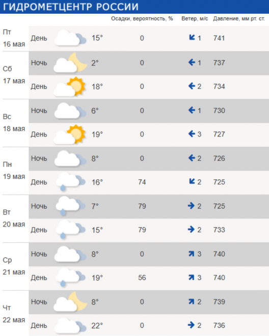 В пятницу, 16 мая, в городе облачно и без осадков: температура воздуха +15℃. Ночью похолодает до +2℃, а уже в субботу синоптики обещают до +19℃, переменную облачность и ветер до 2 м/с.