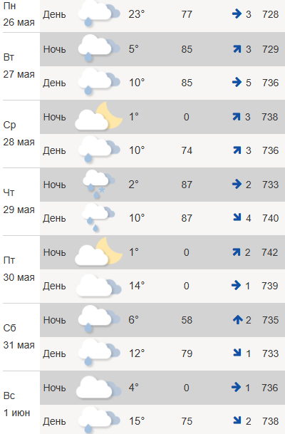 Потеплеет в городе только к пятнице 30 мая, по прогнозу 14°C. Также последний день пятидневки ожидается без осадков.