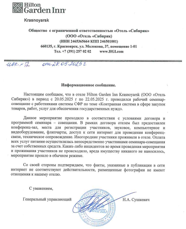 Как ТВК рассказали в Hilton, с 20 по 22 мая в их отеле действительно проводился семинар с сотрудниками СФР. В Красноярск приехали работники Соцфонда из Приволжского, Уральского, Сибирского и Дальневосточного федеральных округов.