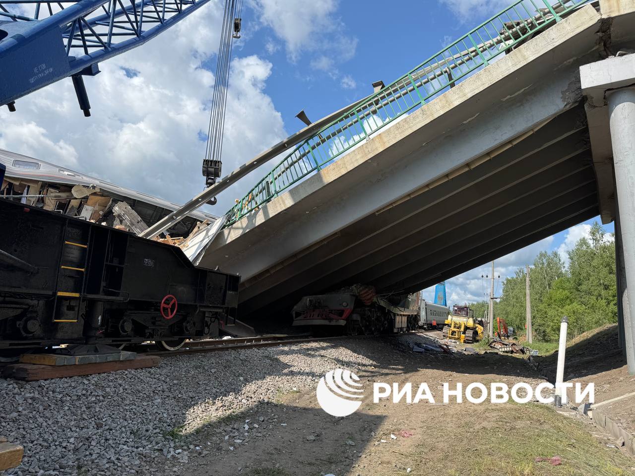 – Поезд врезался в рухнувшие обломки моста. С рельсов сошли локомотив и 4 вагона;