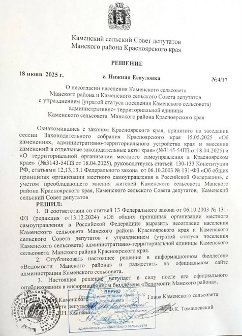Судя по документу, решение Депутаты Каменского сельсовета приняли за сутки до вступления в силу муниципальной реформы – 18 июня. Согласно новому закону, территория Каменского сельсовета, которая входила в состав Манского района, теперь включена в Манско-Уярский муниципальный округ, где административным центром станет город Уяр.