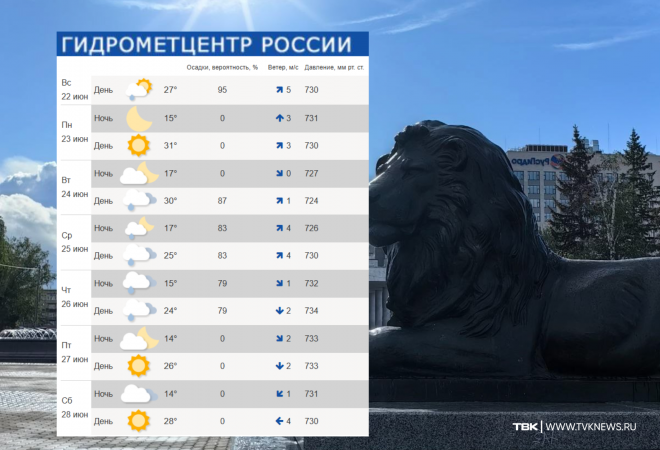 Понедельник, 23 июня, будет самым жарким днем на неделе. По прогнозам синоптиков, будет от +17°C до +31°C. Со вторника, 24 июня, начнутся дожди. При этом днем обещают те же +30°C, а ночью +17°C.