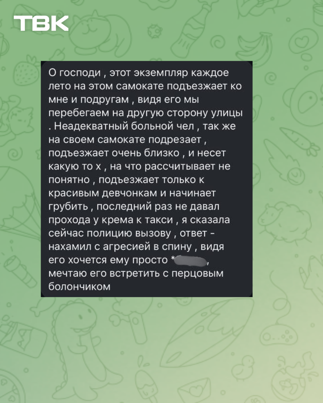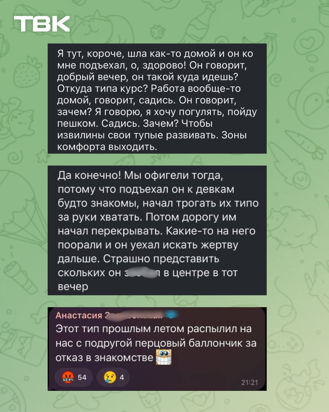 В июне красноярка Карина рассказала ТВК, что неизвестный оскорблял ее и пытался сбить, когда она ехала на велосипеде. Девушка сняла мужчину на видео и выложила в соцсетях, а в ответ получила множество подобных историй от других горожанок.