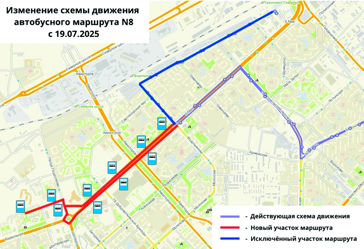 Кроме того, из маршрута №8 исключат остановки:Конечная остановка также изменится. Автобус вместо «станции Красноярск-Северный» будет доезжать до Кардиоцентра. В мэрии заявляют, что таким образом жители правобережья смогут добраться до медучреждения без пересадок.