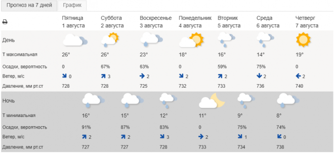 В воскресенье, 3 августа, днем обещают до +23°C, ночью – до +12°C. Будет облачно, также пойдет небольшой дождь. Ветер западный до 2 м/с.В субботу, 2 августа, в дневное время также до +26°C. Прогнозируется переменная облачность, пойдет небольшой дождь. Ночью – до +15°C. Ветер юго-западный до 3 м/с.