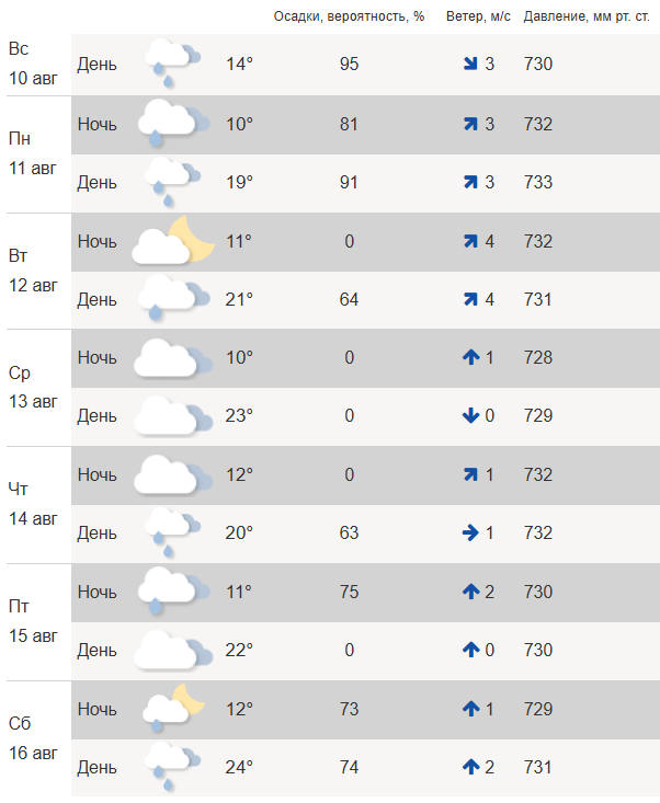 12 августа днем по-прежнему пасмурно, небольшой дождь. Температура воздуха до +21°С, ветер 4 м/с. Ночью до +10°С, сообщаю в Гидрометцентре.