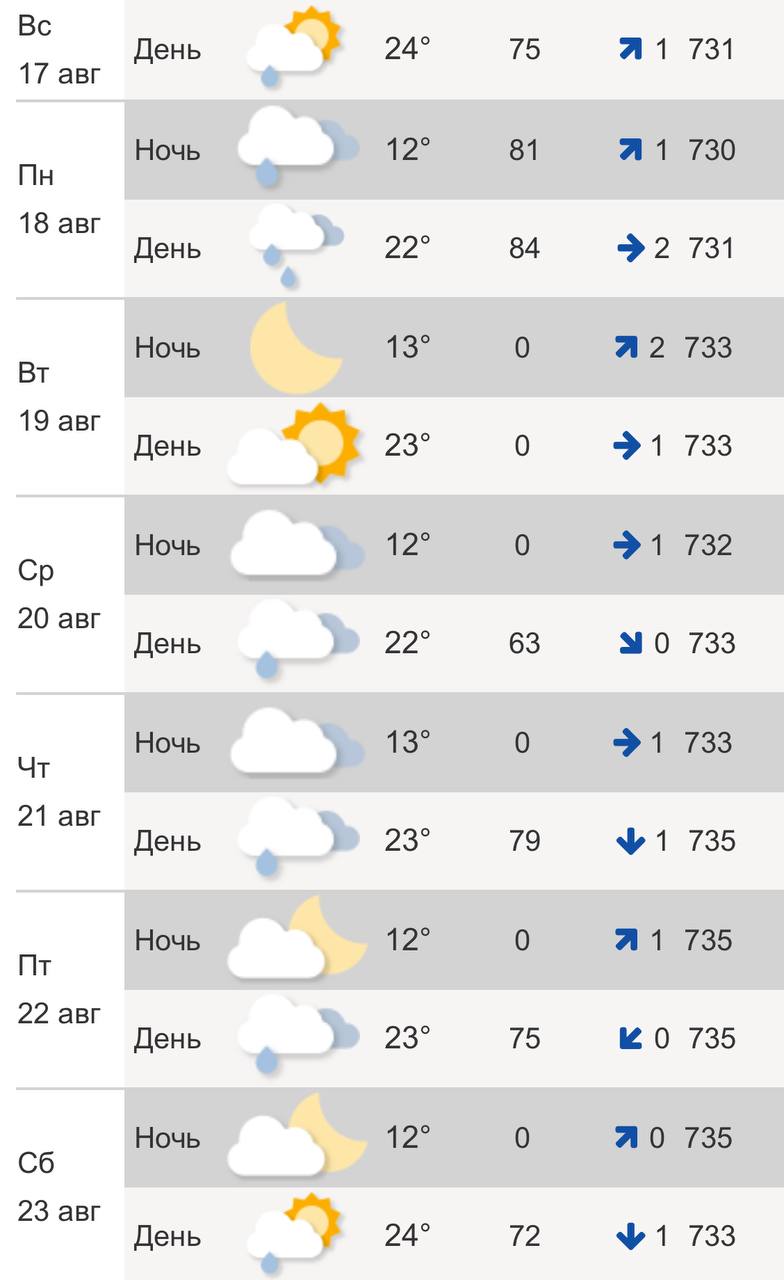 Осадки продолжатся и в четверг, 21 августа, и в пятницу, 22 августа. В эти дни прогнозируется до +23°C. В ночное время – до +12°C.Со среды, 20 августа, в городе вновь ожидаются дожди. Днем синоптики обещают +22°C, ночью температура опустится до +13°C.