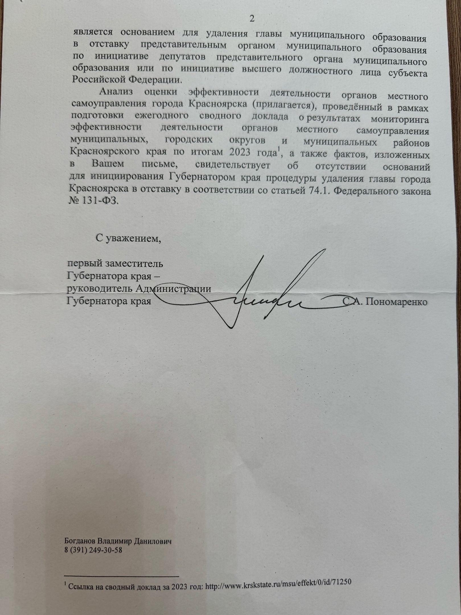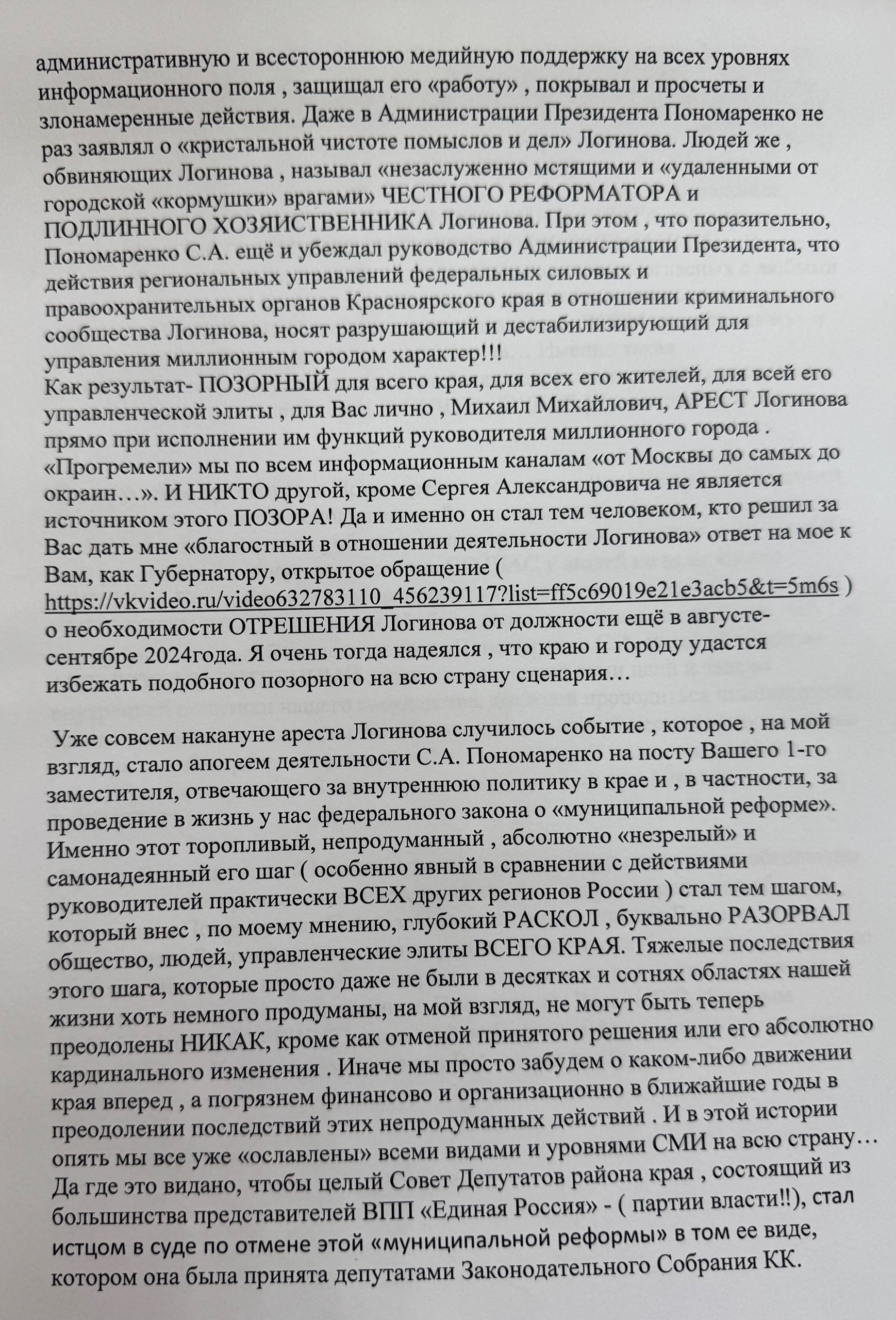 При этом письмо подписал не Михаил Котюков, а его первый заместитель и руководитель администрации губернатора Сергей Пономаренко