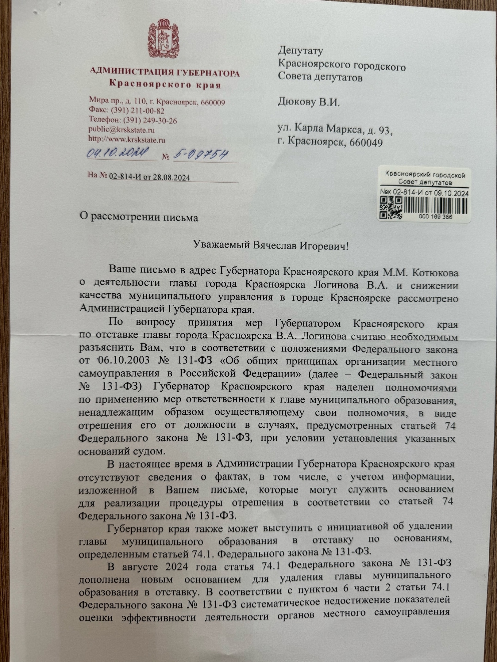Затем, в октябре 2024 года Дюков опубликовал ответ от краевых властей на свое обращение. Согласно документу, губернатор «не нашел оснований для инициирования им процедуры удаления главы города».