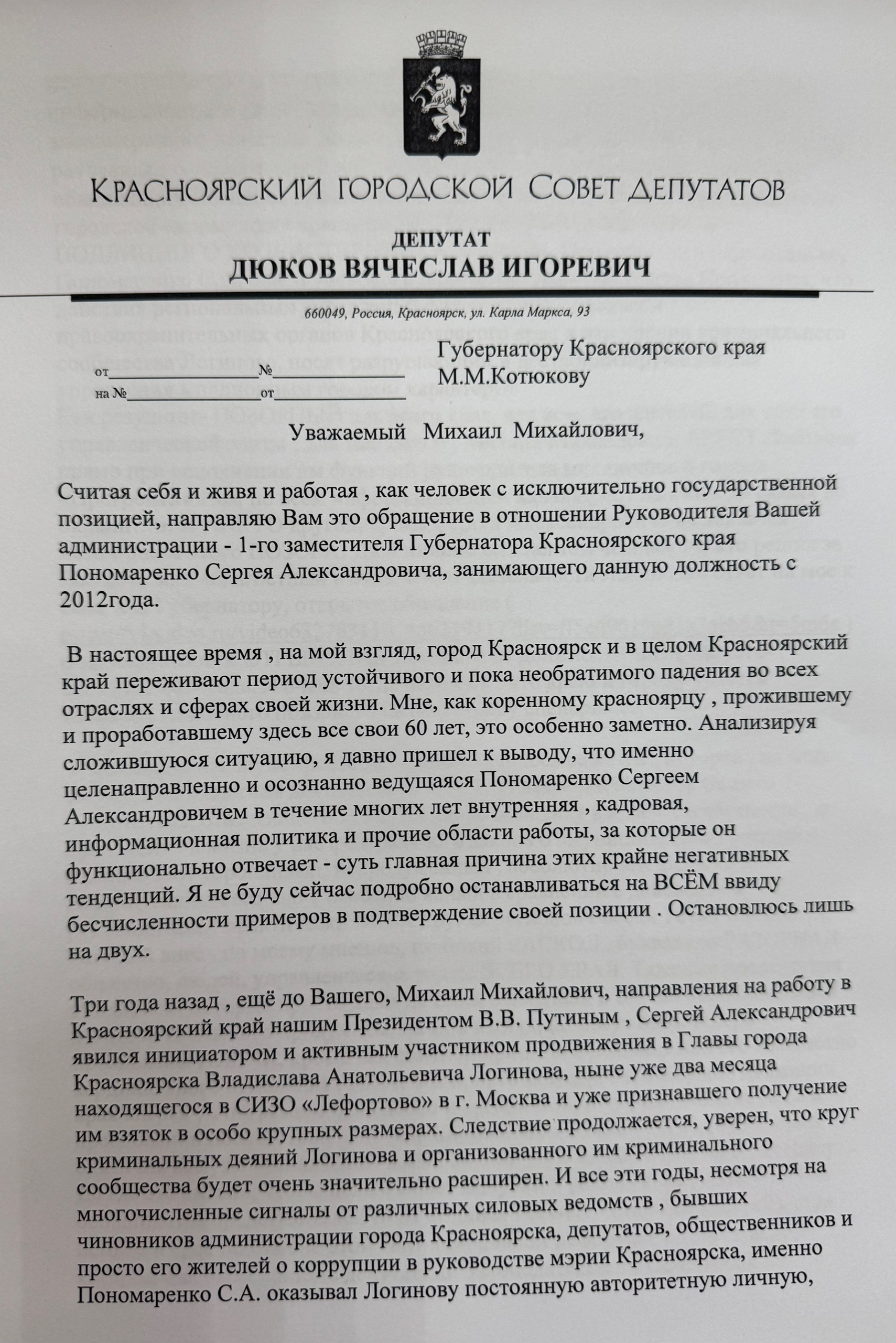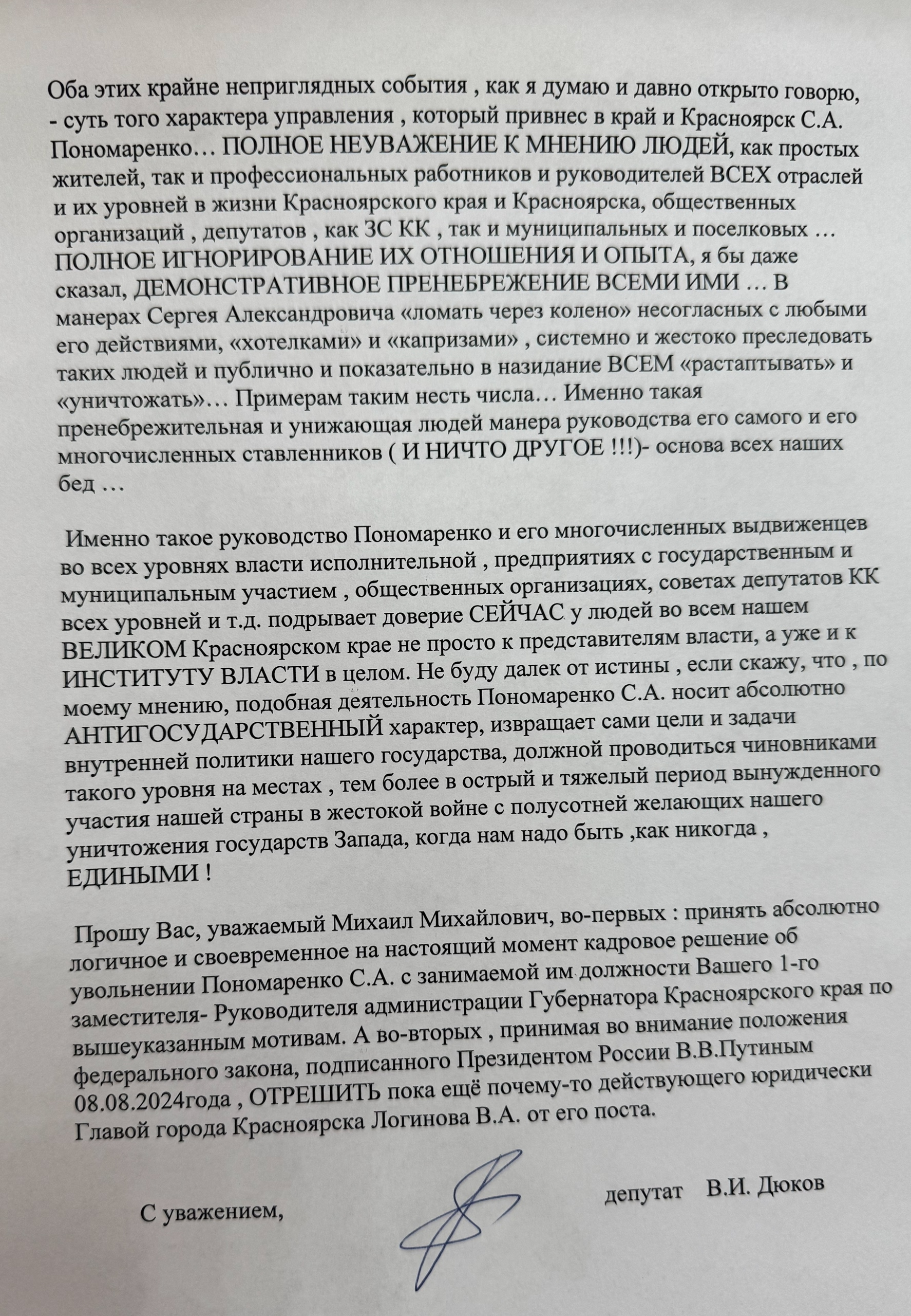 В качестве оснований для отставки Пономаренко Дюков акцентировал внимание на аресте мэра Красноярска Владислава Логинова. По мнению депутата, именно Пономаренко «явился инициатором и активным участником продвижения в Главы города Красноярска Владислава Анатольевича Логинова, ныне уже два месяца находящегося в СИЗО “Лефортово” в г. Москва».