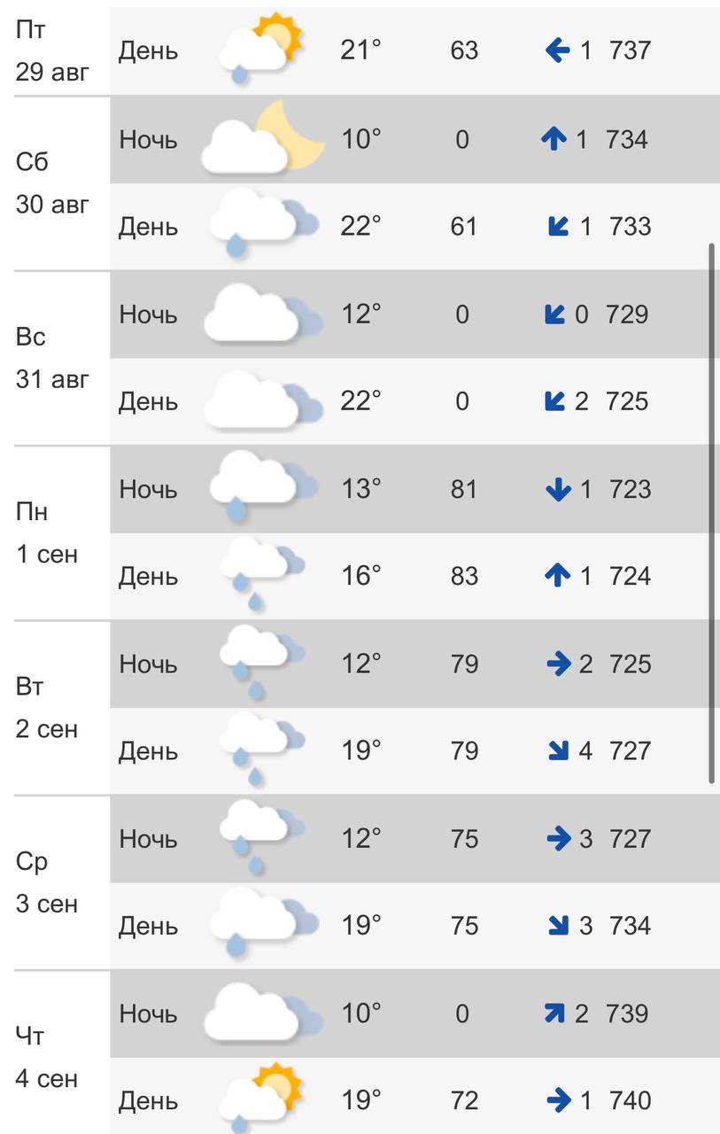 В последний день лета – воскресенье, 31 августа, – днем будет +22°С. Ближе к вечеру начнется дождь, похолодает до +13°С.