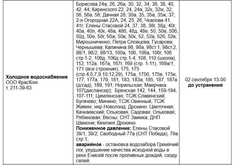Холодную воду в Октябрьском и части Железнодорожного районов собираются отключить с 13:00 второго сентября. Специалисты временно остановят водозабор из-за сильного помутнения Енисея, которое произошло после аномального дождя впервые за 100 лет.