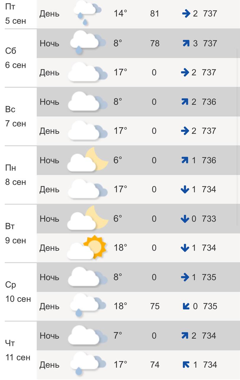 Прогноз погоды дали в Гидрометцентре. В пятницу, 5 сентября, синоптики обещают до +14°C днем и до +8°C ночью. Ожидается дождь.