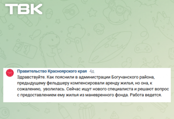 «О данной проблеме знаю, что фельшера в п. Новохайский нет с августа месяца, решаем вопрос по ремонту муниципального жилья, нашли бригаду в с. Богучаны. Подрядчик будет выполнять работы по ремонту + материал (окна, двери, материалы для космет. ремонта – обои, ленолиум ). Проблема по рем. бани, баню практически надо строить новую, но будем решать».