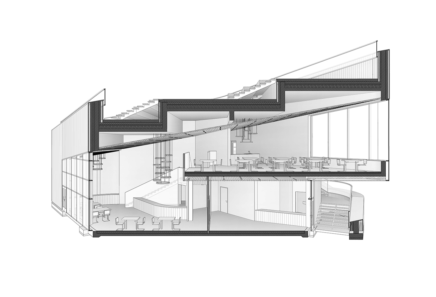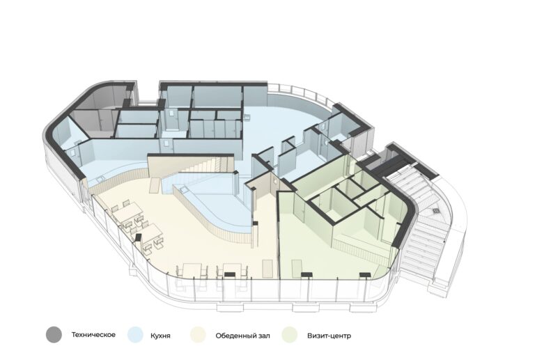 «На первом этаже расположится входная группа ресепшеном, сувенирной лавкой, гардеробом и туалетами, а также технологические помещения кафе и обеденный зал с барной зоной. На втором этаже разместят дополнительный уровень обеденного зала с возможностью выхода на эксплуатируемую кровлю», – пишут архитекторы.