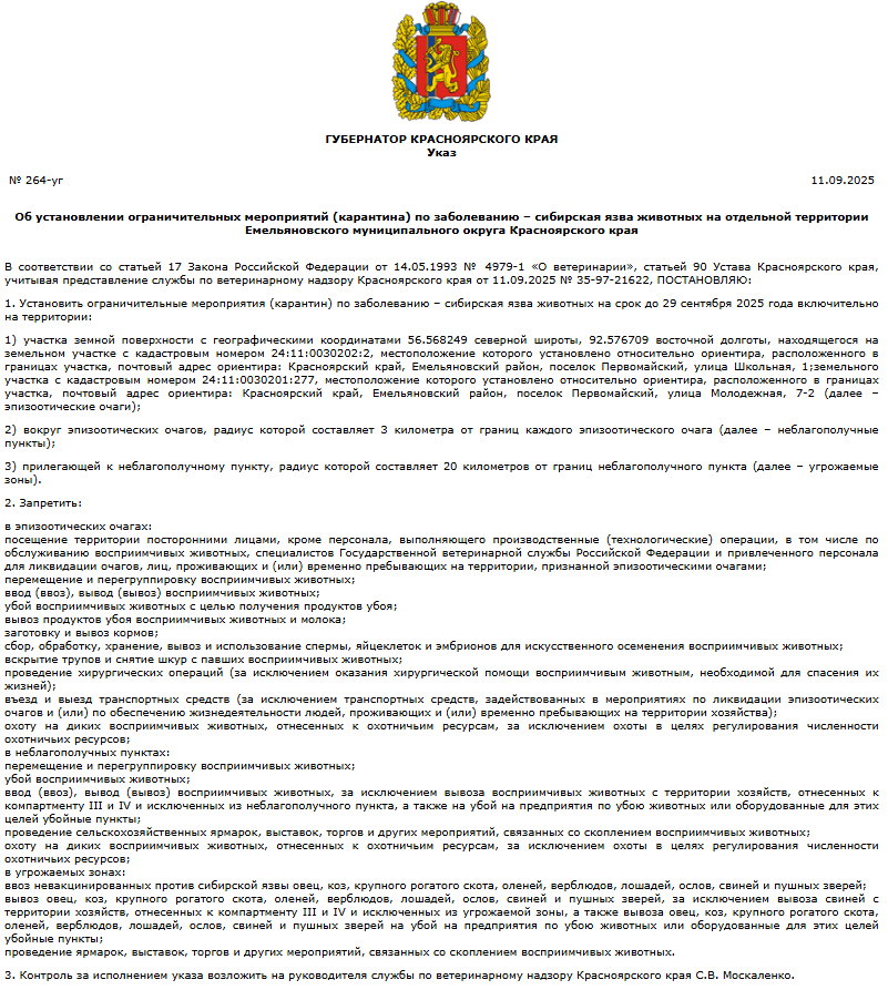По данным администрации Емельяновского района, 10 сентября в поселке Первомайский у «головы КРС» обнаружили палочку сибирской язвы животных. 11 сентября в поселке ввели карантин – информация об этом появилась на официальном портале правительства края.