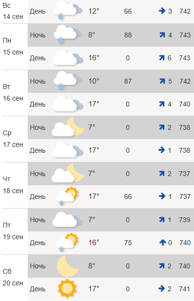 В среду, 17 сентября также +17°C днем и до +7°C ночью. В четверг, 18 сентября вероятны осадки, синоптики обещают +17°C, облачно с прояснениями. Ночью вновь +7°C.
