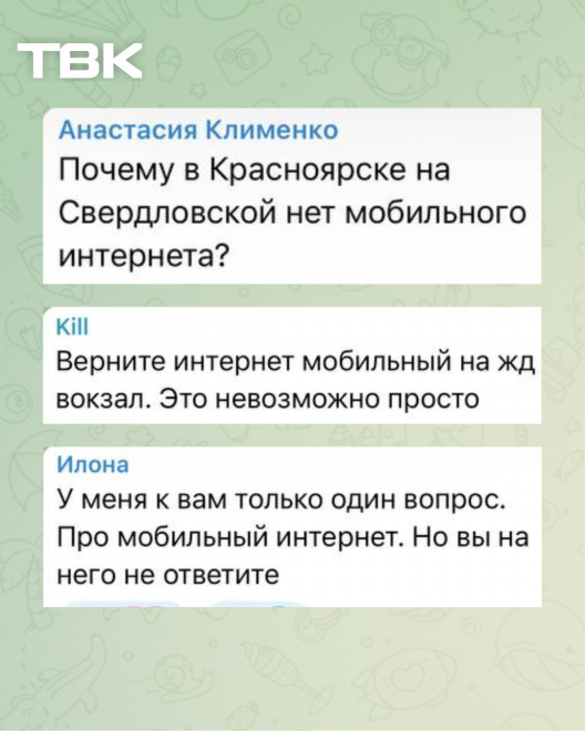 В ответ на официальный запрос от 15 августа [спустя 3 недели с момента отключения интернета] в мэрии заявили, что установка бесплатных точек Wi-Fi «находится в стадии проработки»: определяются места для установки.Разговор корреспондента ТВК с начальником отдела пресс-службы главы Красноярска по поводу бесплатных точек Wi-Fi:
