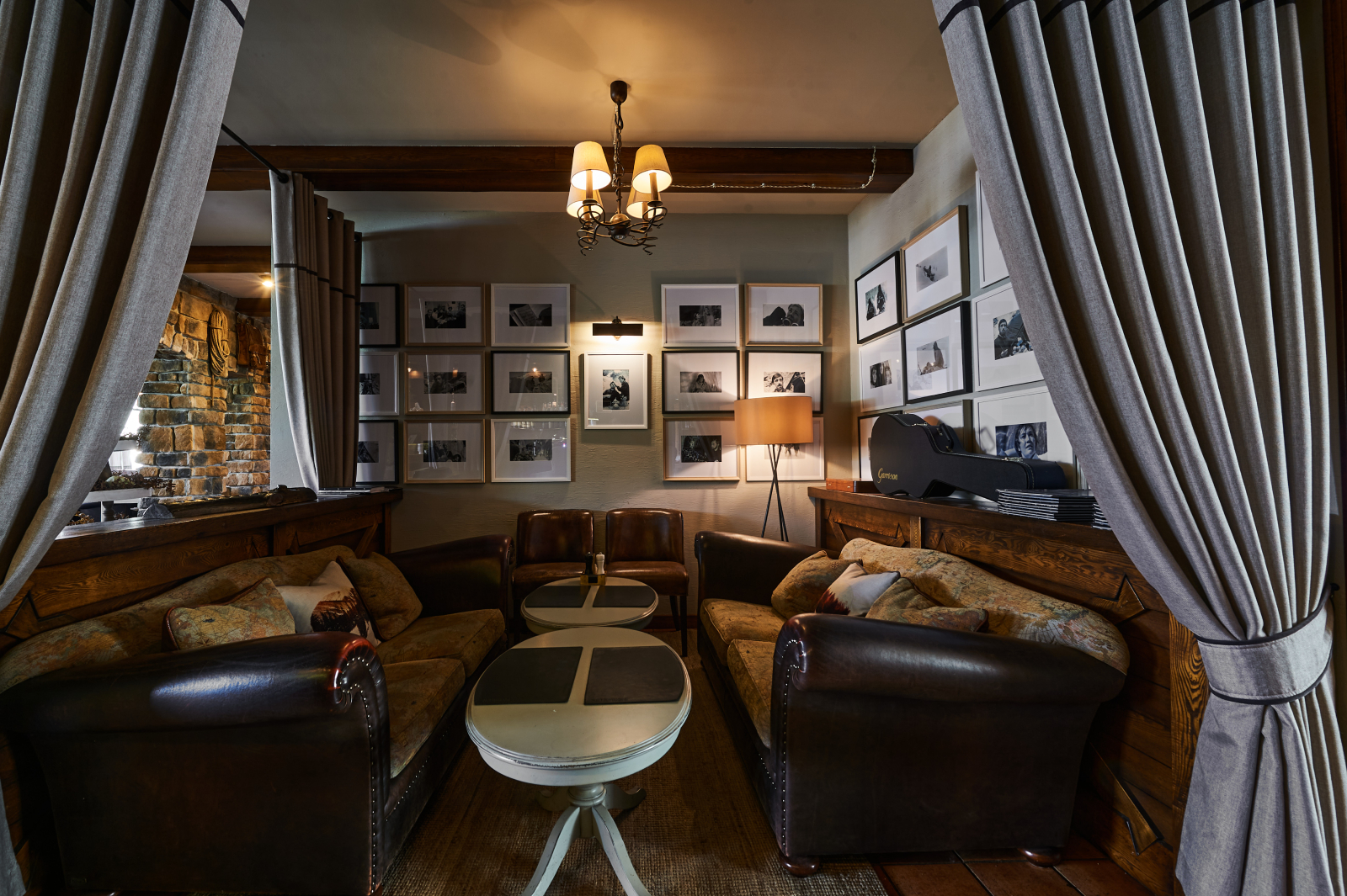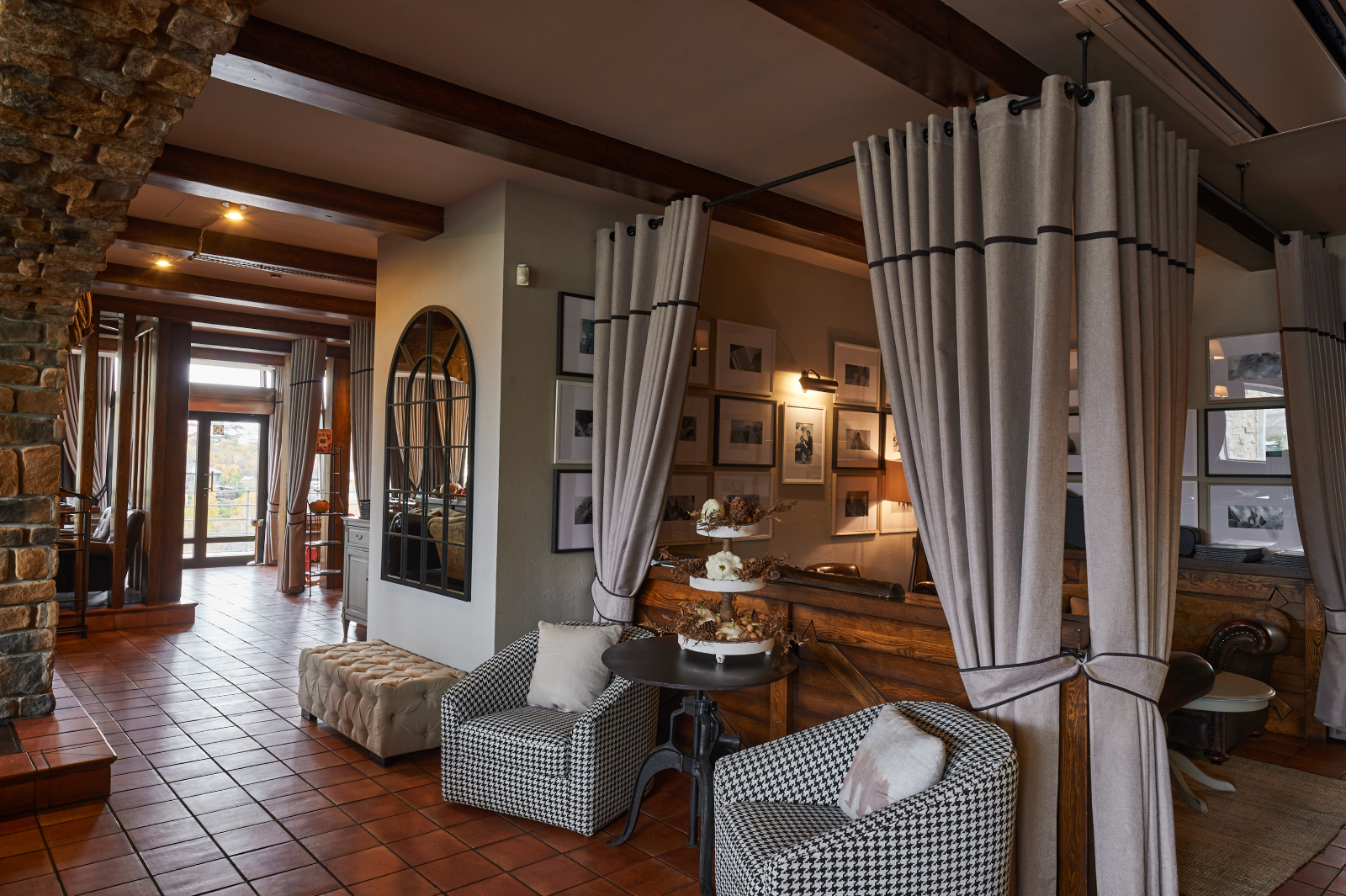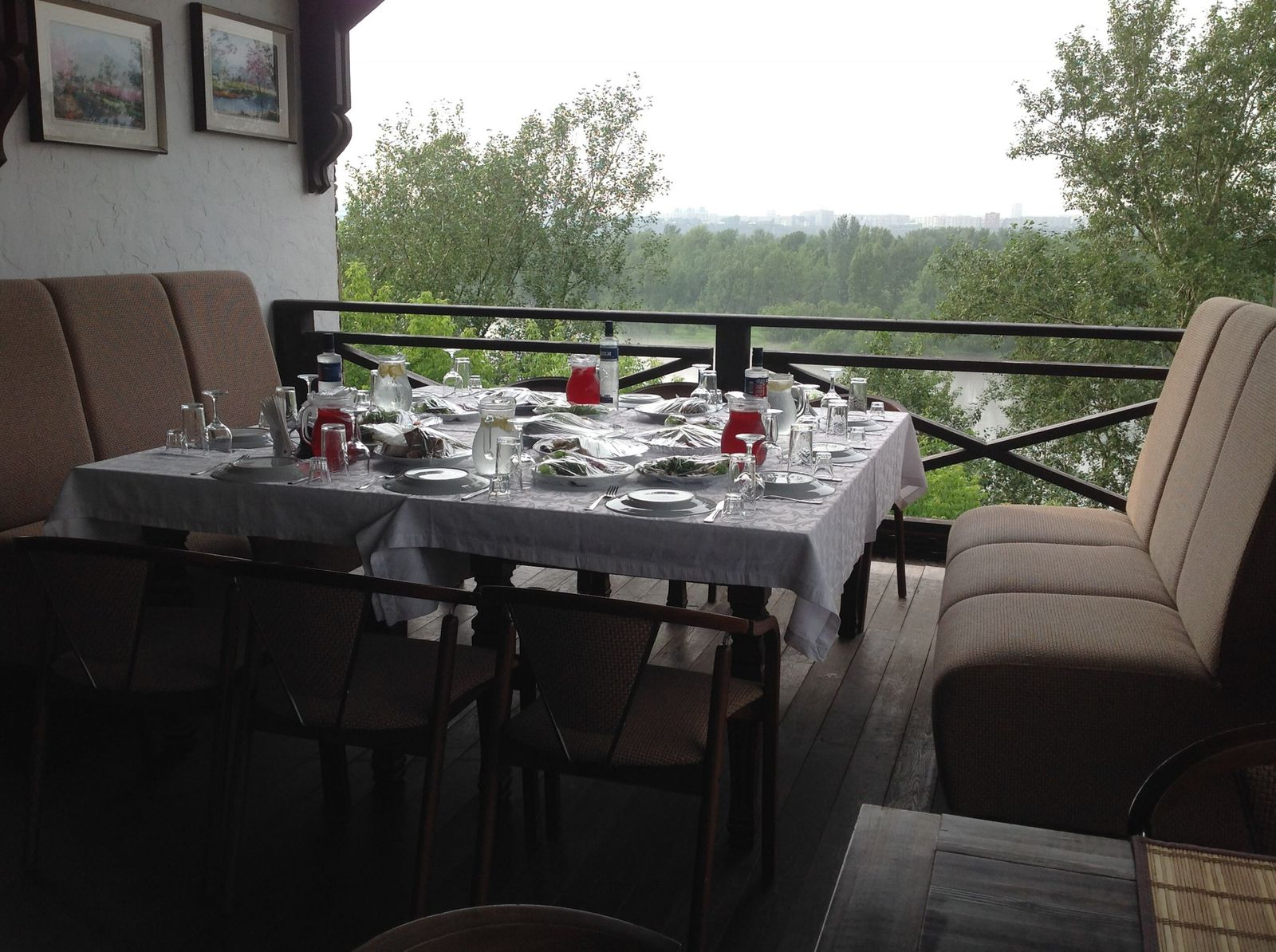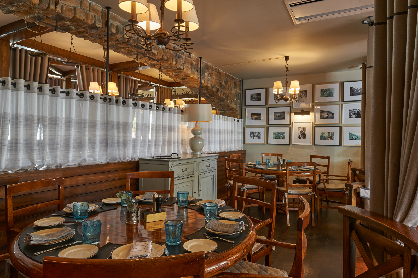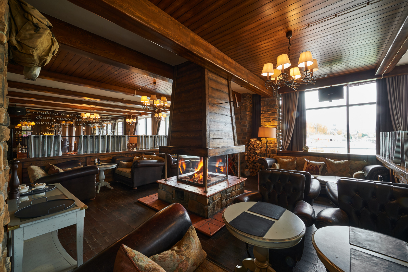 Обстановка ресторана – антураж заповедного леса и реки, потрескивание дров в камине, панорамный вид из окон.