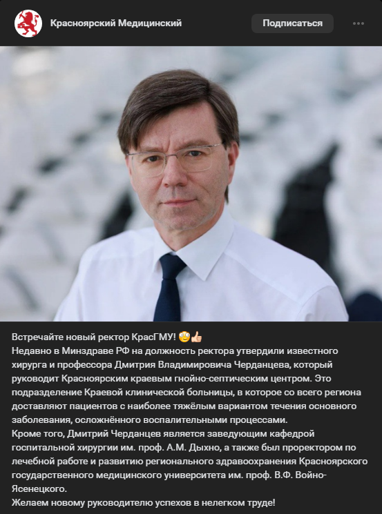 Пост о новом ректоре появился в сообществе «Красноярский медицинский», на странице не впервые публикуют инсайдерскую информацию о жизни университета. По данным группы, на должность ректора КрасГМУ утвердили Дмитрия Черданцева. Как эту новость прокомментировали в университете?