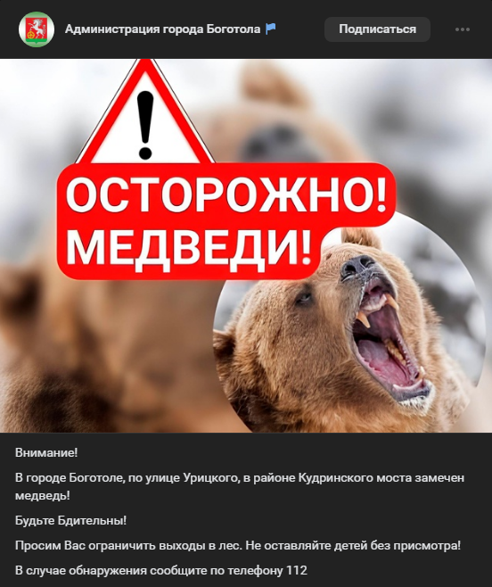 24 сентября о хищниках в городе сообщила администрация Боготола. Медведя заметили на улице Урицкого, в районе Кудринского моста.При этом, как ТВК рассказал начальник отдела госохотнадзора министерства природных ресурсов и лесного комплекса Красноярского края Николай Мальцев, в соцсетях распространяют большое количество фейков.
