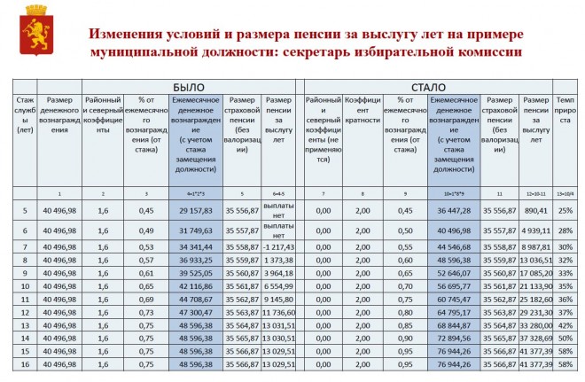 Данные рассмотрены на примере должности секретаря избирательной комиссии, сейчас в Красноярске такой не существует. Ранее секретарь также входил в список лиц, замещающих муниципальные должности, пояснили в мэрии. Поэтому вышедшие на пенсию сотрудники также будут получать выплаты по новым правилам.Депутат представил таблицу, в которой рассмотрено повышение пенсии на примере секретаря избирательной комиссии с зарплатой в 40 тысяч рублей. На данный момент пенсия для сотрудника с 5-летним стажем составляет 29 тысяч рублей. После повышения будет 36,5 тысяч.