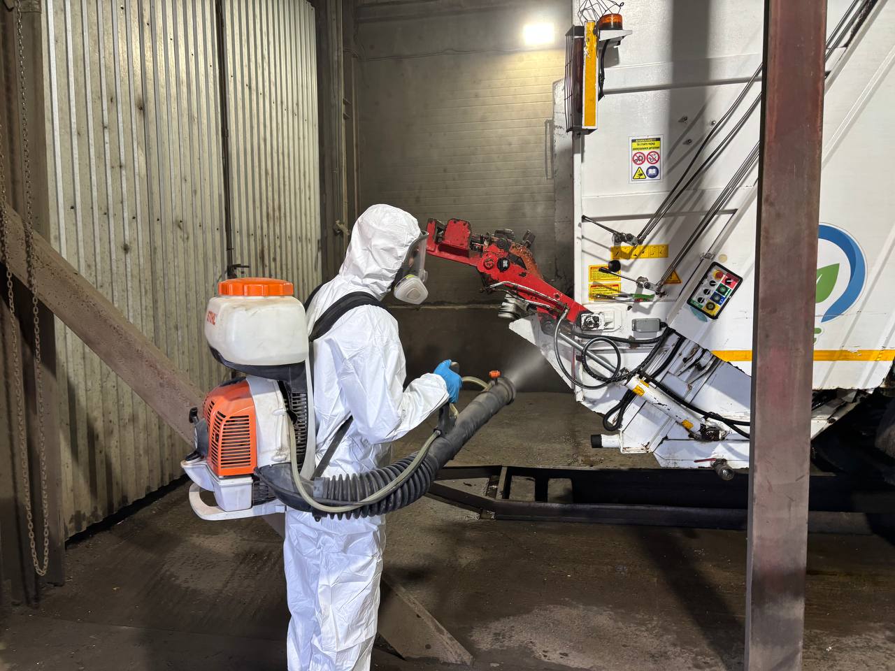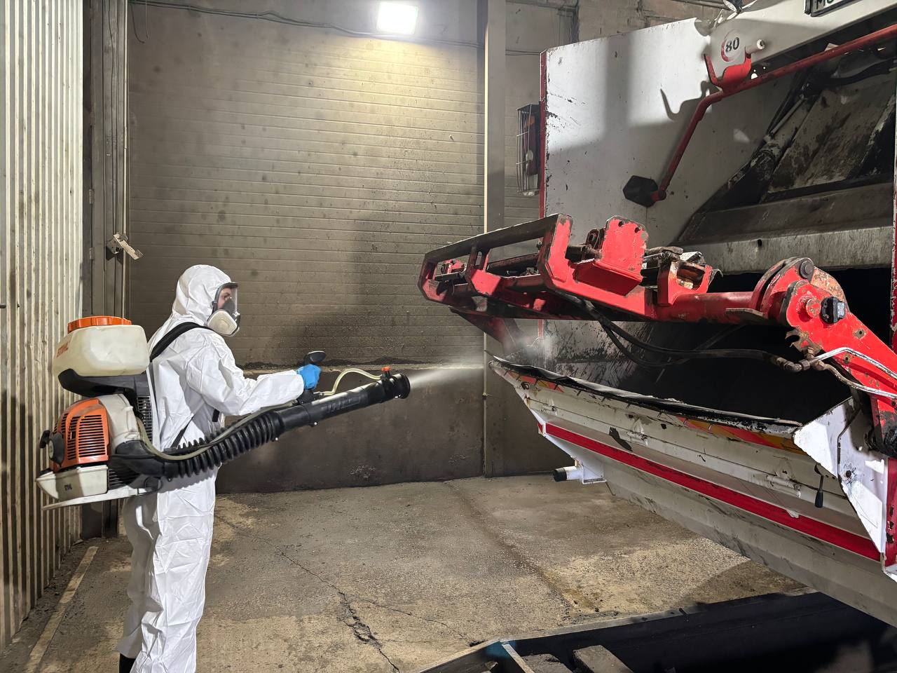 По окончании смены мусоровозы проходят мойку, а затем отправляются на дезинфекцию. Для санитарной обработки используются специальное оборудование и профессиональные дезинфицирующие средства. Обработку мусоровозов проводит лицензированная компания.