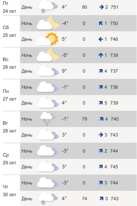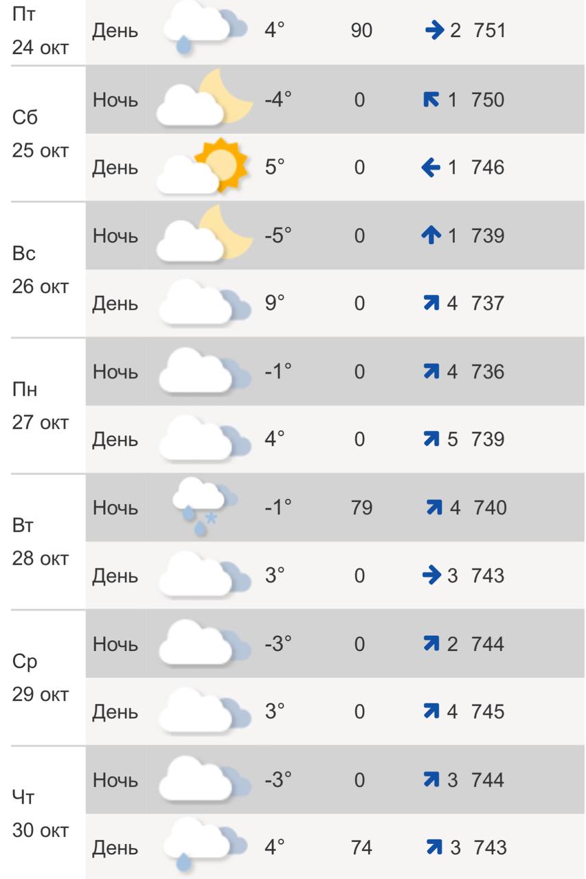 Прогноз погоды дали в Гидрометцентре. В пятницу, 24 октября, днем ожидается +4°C. Облачно, пойдет небольшой кратковременный дождь. Ветер западный до 2 м/с. Ночью похолодает до -4°C.