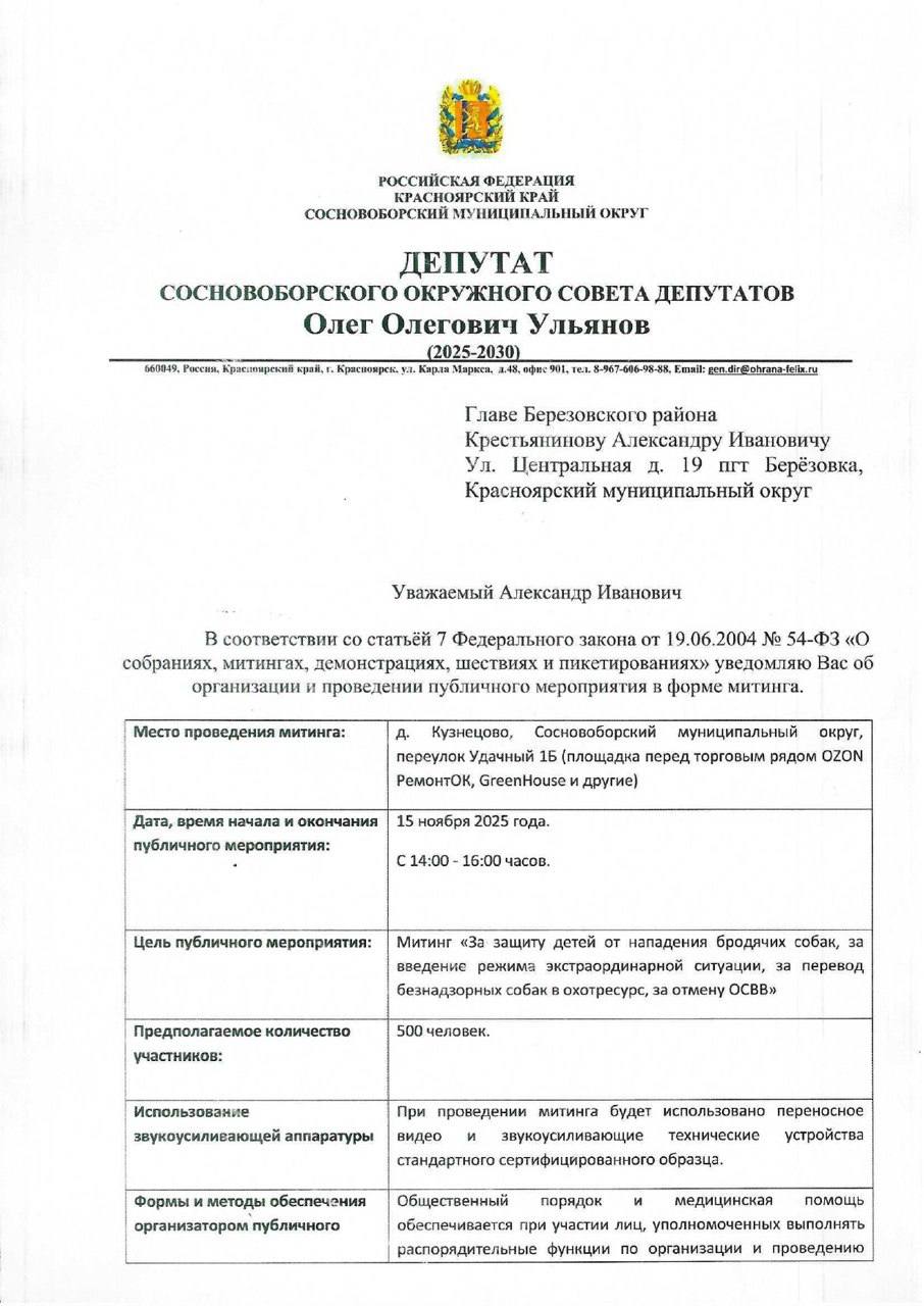 В уведомлении о митинге депутаты предполагают, что мероприятие посетят сразу 500 человек. Олег Ульянов считает, что власти разрешат провести митинг, несмотря на указ губернатора времен COVID-19, запрещающий проводить массовые мероприятия.«Я разговаривал с Госохотнадзором и спрашивал их мнение – чем отличается волк, который вырос в дикой природе, от собаки, которая тоже выросла в дикой природе? Только тем, что собака не входит в перечень видов добычи, в перечень ресурсов для добычи. И, следовательно, волка можно отстреливать, а собаку нельзя. В этом только различие. Но, если волк вышел из леса и загрыз человека, то мы ничего спрашиваем – его надо умертвить. А собаку нельзя, потому что это домашнее животное. Но собака же выросла в лесу. Ну, следовательно, здесь надо дифференцировать», – заявил в разговоре с ТВК депутат Сосновоборского окружного совета депутатов Олег Ульянов.