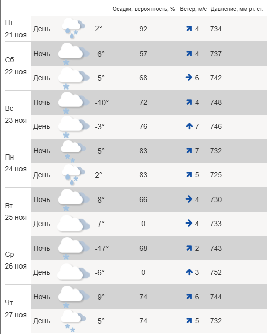 Рабочая неделя начнется с «плюса»: в понедельник, 24 ноября будет до +2°C, облачно с осадками. В ночь на вторник, 25 ноября прогнозируют до -8°C. На протяжении недели, говорят синоптики, дневные температуры будут в районе -7°C. Но в ночь на среду, 26 ноября резко похолодает – сразу до -17°C.