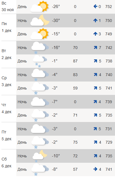 В понедельник, 1 декабря, синоптики прогнозируют -15°C, облачно с прояснениями. Ночью немного похолодает до -6°C, пойдет снег. Во вторник, 2 декабря, погода резко изменится: