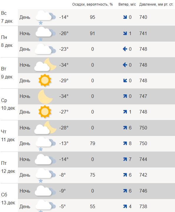 Резкий перепад температуры произойдет в четверг – днем температура воздуха прогреется до -13℃, выпадет небольшой снег. Ветер до 8 м/с. В ночь на пятницу ожидается до -14℃, ветер до 7 м/с. Днем 12 декабря в городе потеплеет до -8℃.