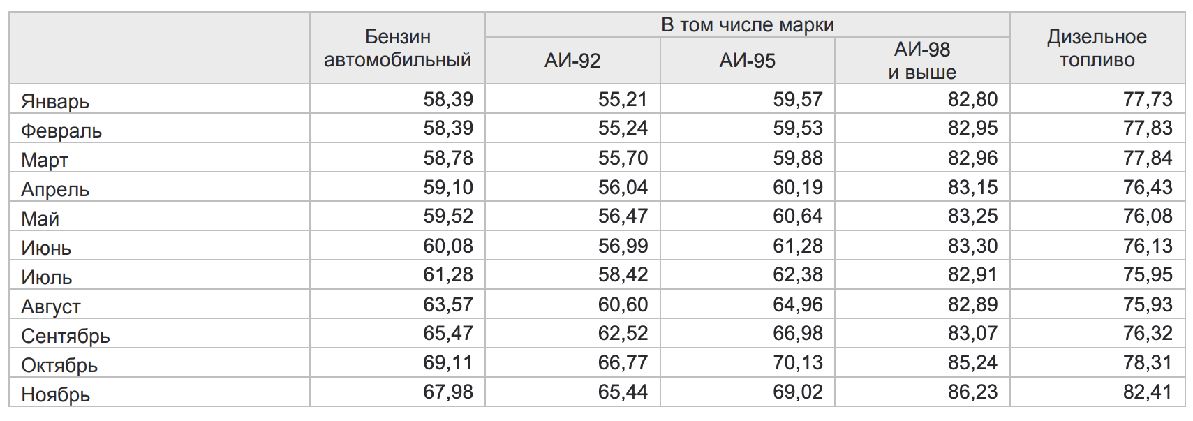 По данным статистиков, в среднем в ноябре литр бензина стоил 67,98 рублей. Это на 1,66% меньше, чем в октябре.Литр АИ-98 подорожал на 1,16%, а дизельное топливо – на 5,23%.