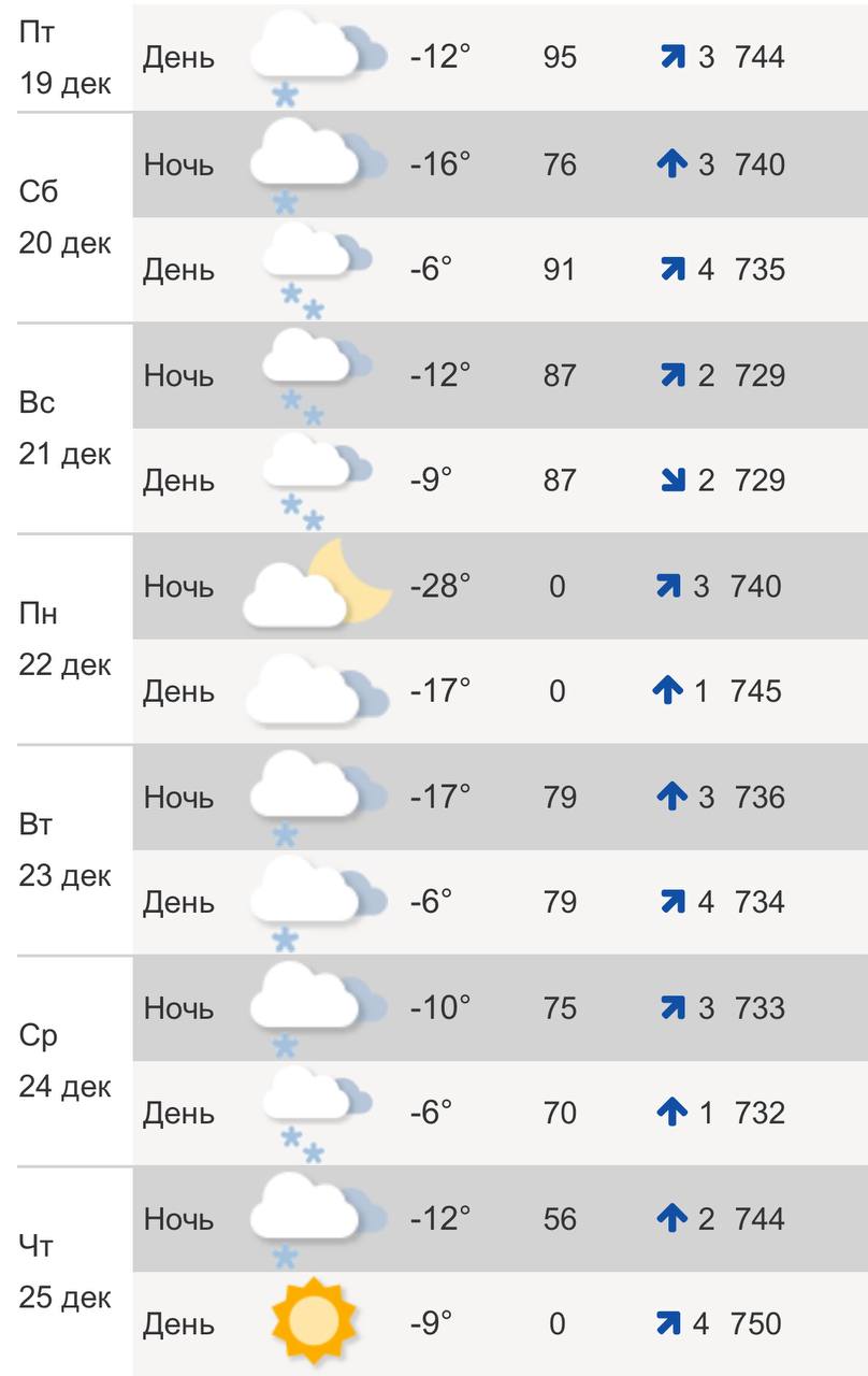В воскресенье, 21 декабря, в дневное время прогнозируют -9°C. Будет также облачно. Ветер северо-западный 2 м/с. Ночью – до 28°C.В субботу, 20 декабря, днем – до -6°C. Облачно, прогнозируют снег. Ветер юго-западный 4 м/с. Ночью похолодает до -12°C.