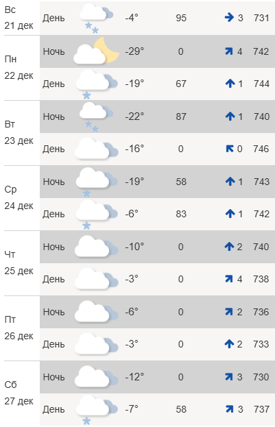 В пятницу, 26 декабря, синоптики обещают до -3°C. Ночью похолодает до -12°C. В субботу, 27 декабря, будет -7°C, облачно и пойдет снег.В понедельник, 22 декабря, синоптики прогнозируют -19°C, пойдет снег. Ночью немного похолодает до -22°C, также снежно. Во вторник, 23 декабря, днем до -16°C и облачно. Ночью -19°C.