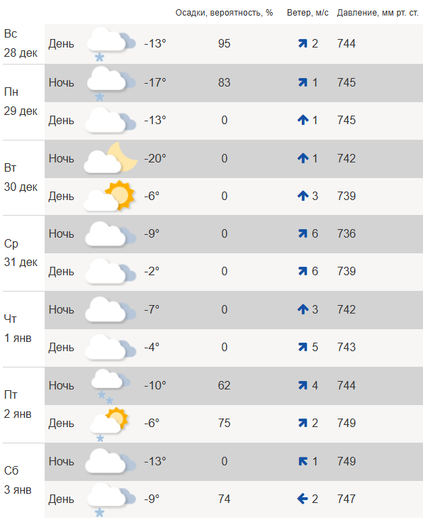 В ночь на 1 января будет -7°C, днем до -4°C, ветер от 3 до 5 м/с. В пятницу, 2 января, в городе обещают снежную погоду и температуры от -10°C до -6°C, ветер от 2 до 4 м/с.