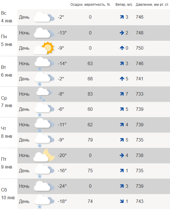 В четверг, 8 января, днем обещают до -9°C и снег. Ночью температура воздуха опустится до -20°C. В пятницу, 9 января, в городе будет до -16°C, ветер до 1 м/с. В ночь на субботу – морозы до -24°C.
