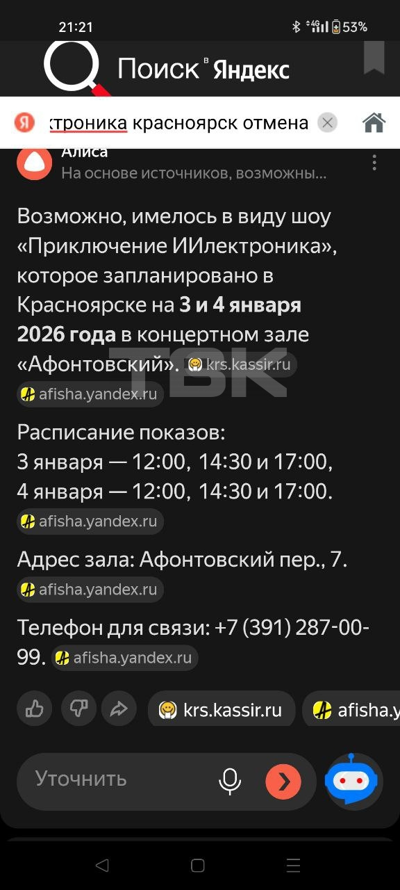 Жители Красноярска сообщили в редакцию ТВК о продаже билетов на шоу «Новогодние приключения ИИ-лектроника», которое так и не состоялось. Представление было запланировано на 3 января в концертном зале «Афонтовский». Часть зрителей заявляет, что не получила уведомлений об отмене и не может вернуть деньги.