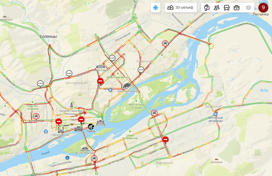 «Снег внезапно зимой пошел»: 9-балльные пробки сковали Красноярск после ночного снегопада