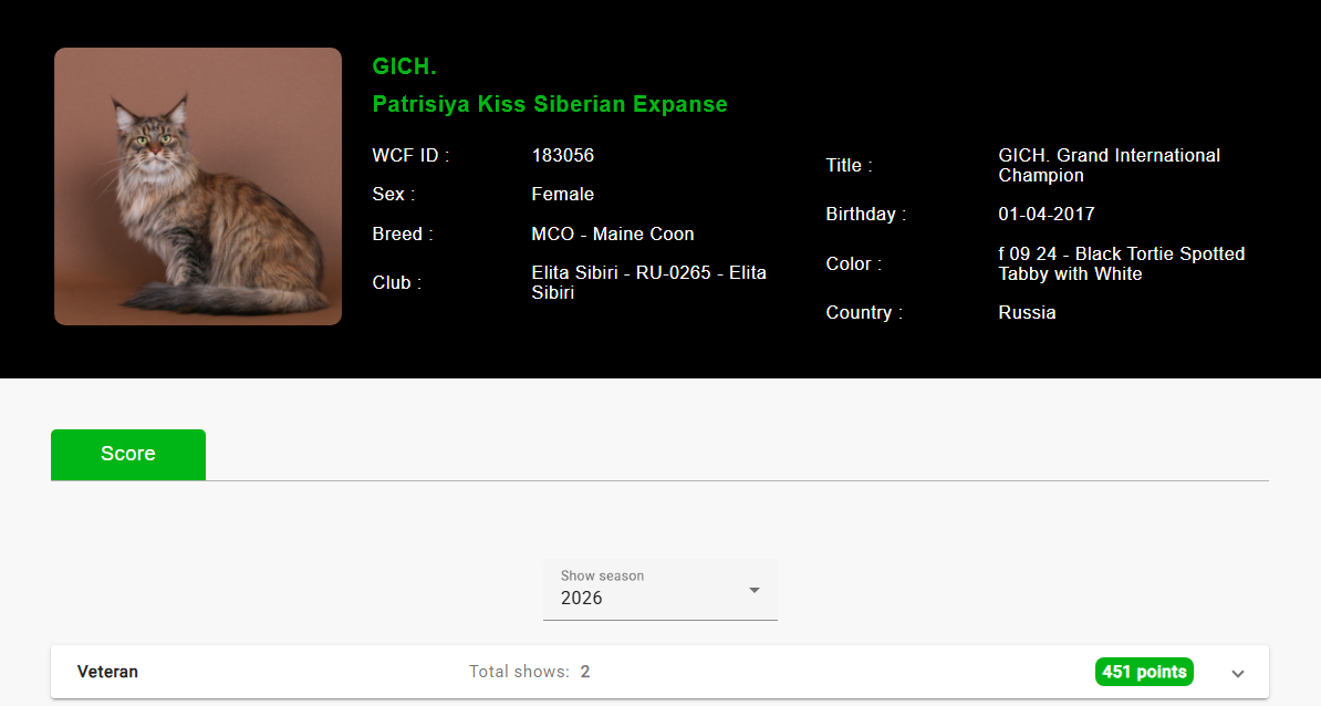 По данным WCF, 8-летняя Патрисия выступает от клуба любителей кошек «Элита Сибири» и уже имеет титул Grand International Champion. Ее окрас имеет отдельную кодировку – F 09 24, что расшифровывается как «черный черепаховый пятнистый тэбби с белым».