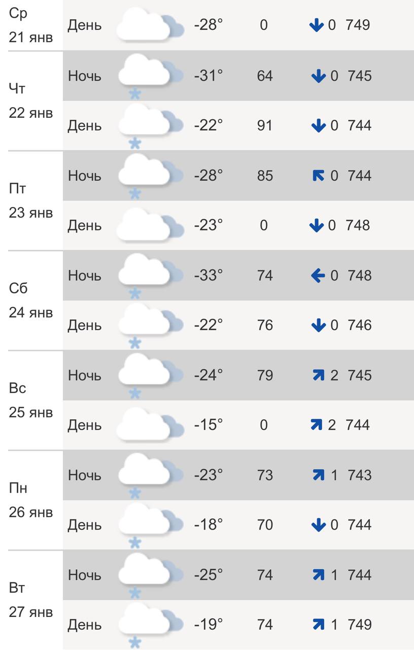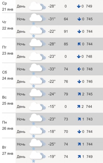 В субботу, 24 января, красноярцев ждет -22°C днем и -24°C ночью. В воскресенье, 25 января, днем потеплеет до -15°C. Ночью – до -23°C.В пятницу, 23 января, в дневное время ожидается -23°C. В ночное же похолодает до -33°C.