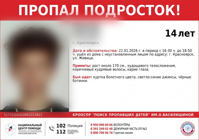 Если вы обладаете информацией об обстоятельствах исчезновения подростка – сообщить можно по телефону: 8 (391) 227–06–45 или в полицию.Мальчика ищут правоохранители и волонтеры. Приметы: рост около 170 см, телосложение худощавое, волосы темно русые кудрявые, глаза карие. Был одет: куртка болотного цвета, светло-синие джинсы, ботинки черного цвета.