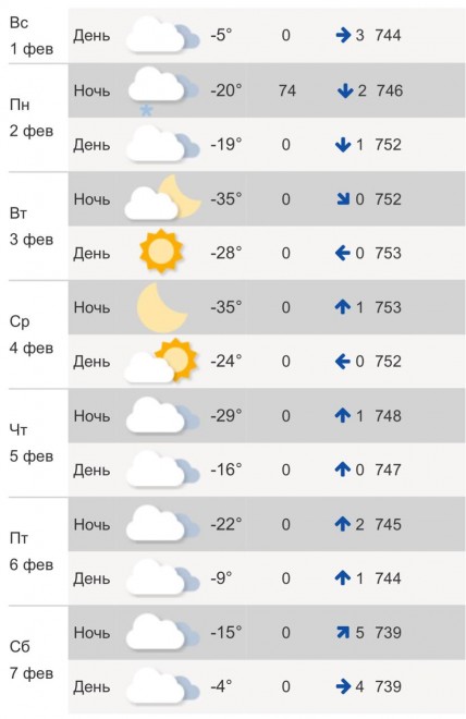 В среду, 4 февраля, днем прогнозируют -24°C. Переменная облачность, без осадков. В ночное время – до -29°C.Во вторник, 3 февраля, в дневное время обещают -28°C. Малооблачно, без осадков. Ночью – до -35°C.