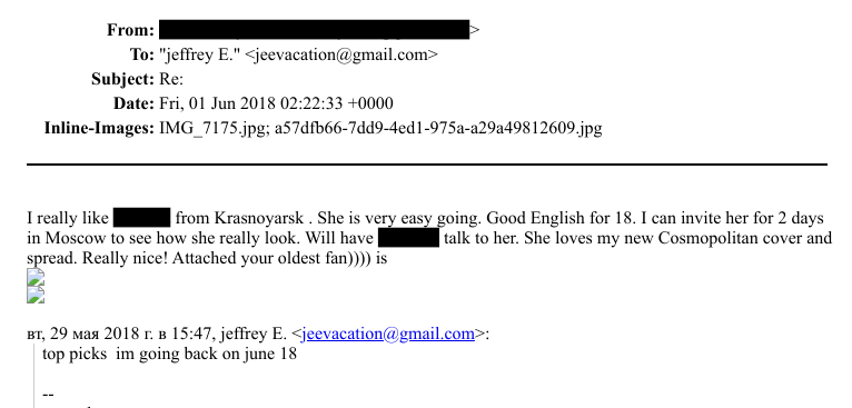 Отметим, Красноярск в файлах упоминается еще раз в 2018 году. На неизвестный электронный адрес Эпштейн пишет сообщение: «Подборку из лучших. Я вернусь 18 июня». В ответ на это неизвестный пользователь прикрепляет фото и пишет:
