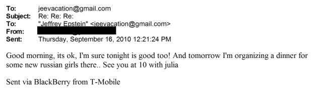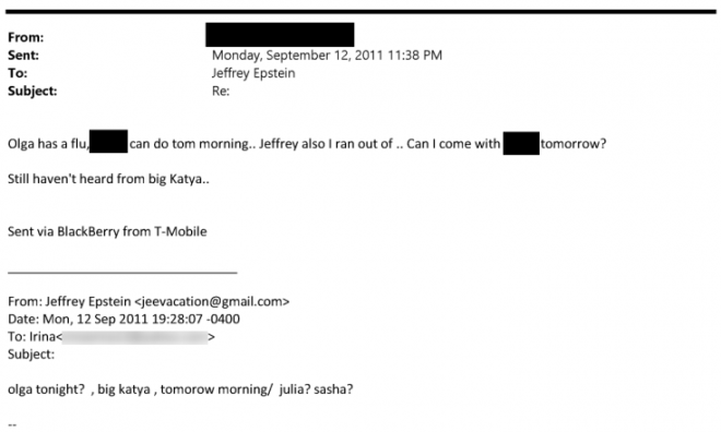 Затем, почти в каждом сообщении о «новых друзьях», которых Ирина рекомендует для Эпштейна – фигурируют имена девушек из России, Украины и Беларуси. В разное время дня и ночи собеседница Эпштейна предлагает ему организовать встречи с еще одной Ириной, Женей, Ольгой, Оксаной, Катей, Татьяной, Юлией, Надей, Викторией, Еленой и несколькими Дарьями.