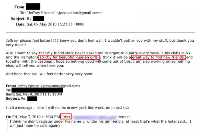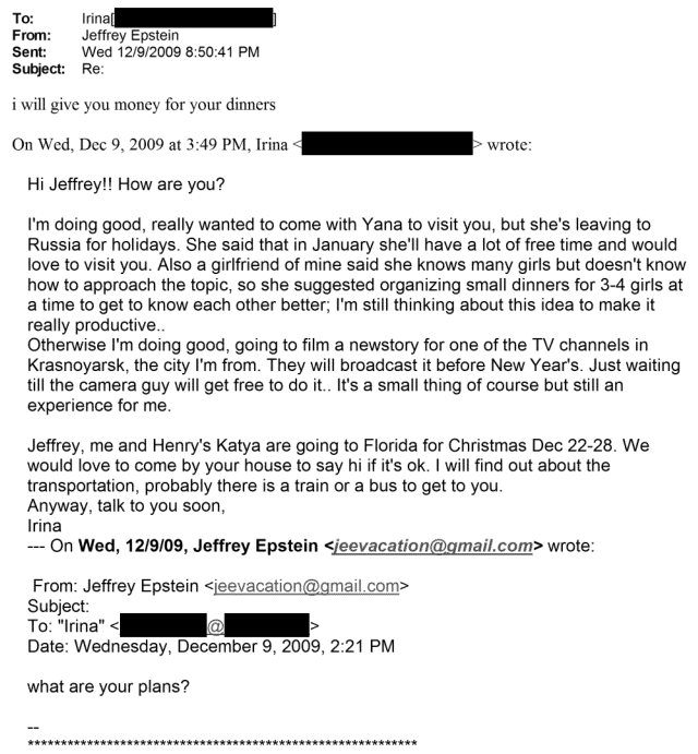 Ирина пишет Эпштейну, что это прекрасный способ «завести новых друзей». «Новые друзья» – формулировка, которая особенно часто повторяется в переписке между Ириной и Джеффри.