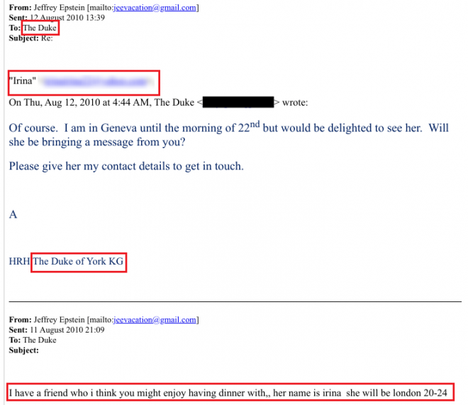 Согласно опубликованным Минюстом США файлам, контакт Ирины Эпштейн присылал даже младшему брату короля Карла III, третьему ребенку и второму сыну королевы Елизаветы II – Эндрю Маунтбеттен-Виндзору. В переписке член королевской семьи подписывает себя по-простому – «Герцог».К 2011 году Эпштейн уже долго был в контакте с Ириной, поэтому имена русских девушек начали повторяться. В одном из документов Эпштейн, например, настаивает именно на «новой Жене». Также в файлах можно найти, как при организации встреч Ирина уточняет, хочет ли Джеффри встретиться с «большой или маленькой Катей».