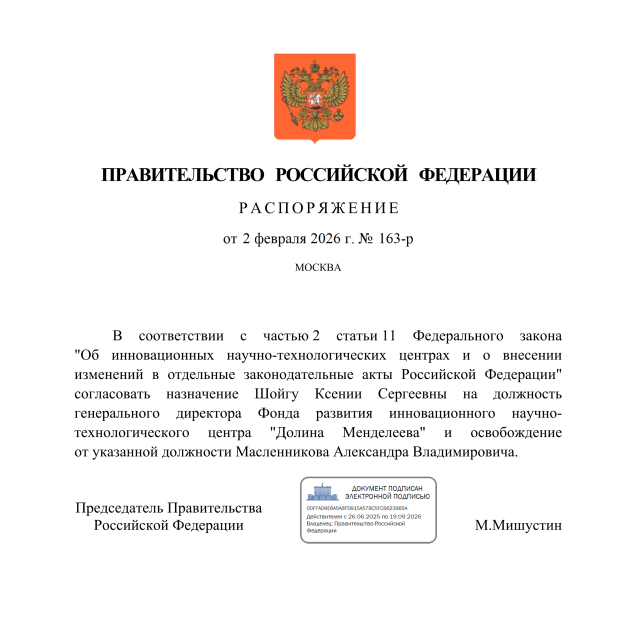 2 февраля вышло распоряжение Правительства, в котором председатель Правительства РФ Михаил Мишустин назначил Ксению Шойгу, дочь секретаря Совета Безопасности РФ Сергея Шойгу, генеральным директором Фонда развития инновационного научно-технологического центра «Долина Менделеева».