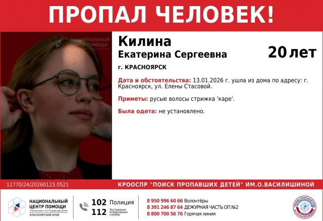 20-летняя Екатерина Килина пропала в Красноярске в ночь на 14 января. Студентка заочного отделения СФУ вышла из дома, где вместе с подругой снимает квартиру. Телефон и паспорт она оставила дома. После того, как Екатерина вышла из своего подъезда, она направилась в сторону выхода из жилого квартала. Частично восстановить маршрут поисковикам удалось благодаря камерам наблюдения.