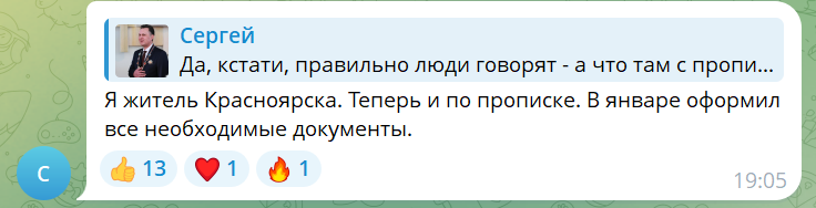 В комментариях к публикации в telegram-канале Сергея Верещагина красноярцы напомнили мэру об обещании сменить место регистрации. Вот, что они написали [орфография и пунктуация авторов сохранены]: